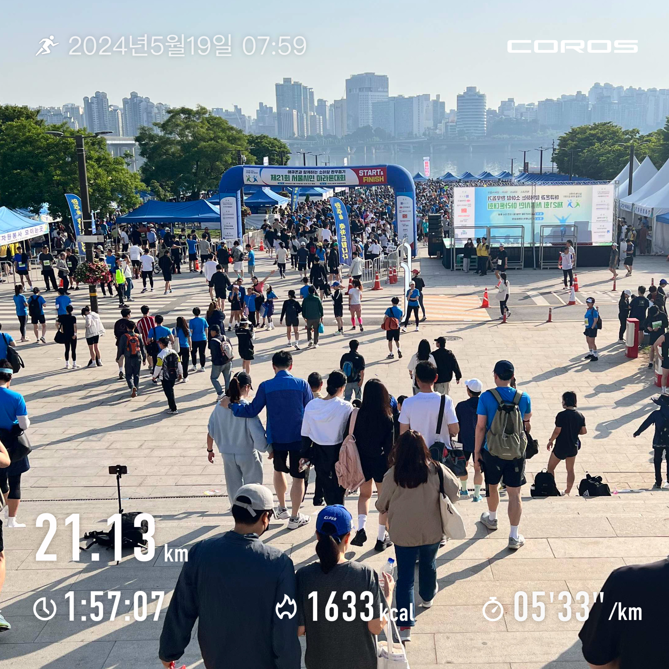 주요 지점마다 동호회 및 지인들이 보내는 응원과 환호는 설령 나와 전혀 관계 없는 사람들의 것이라고 해도 다소 떨어진 페이스를 올려주는 마법 같은 힘이 있다. 날 응원하는 사람들이 아닌 그 인파를 빨리 벗어나고자 하는 어떤 민망함에서 기인하는 것일까.