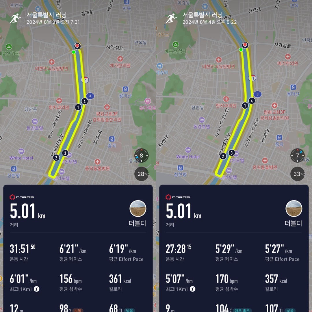 분명 같은 코스를 같은 강도로 달렸는데, 심지어 일요일 러닝은 폭염주의보가 있었을 정도로 온습도가 토요일보다 악조건이었는데 일요일 러닝이 뭔가 몸도 가볍고 기록도 좋게 나와서 원인이 무엇일까 찾아보게 되었다.